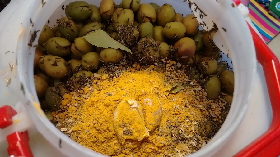 Meter las aceitunas en una garrafa, poner los ingredientes y cubrir con agua. No poner mas agua de la que llegue a cubrir las aceituna ya que entonces la cantidad de sal no será la adecuada. La sal va en proporción a kg de aceituna y no a la cantidad de litros de agua,