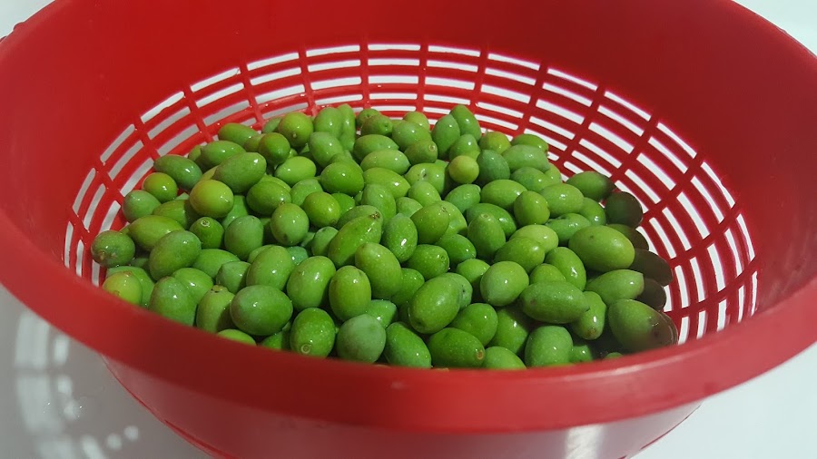 1.- Lavamos las aceitunas. Después si no tenéis una piedra para darles un golpe, cogéis un cuchillo y les hacéis un corte a cada una de ellas. Esto se hace para ayudar a que se quite al sabor amargo que tienen recién cogidas.