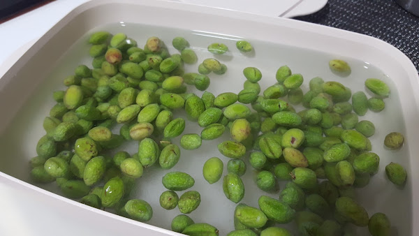 2.- Una vez que hemos ese corte las ponemos en a remojo en con bastante agua que las cubra y dos o tres puñados grandes de sal, en un recipiente que taparemos.