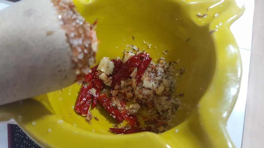6.- En un mortero, echaremos dos de los ajos pelados, las guindillas a rodajas y un puñado de sal. Lo machacaremos bien y lo reservamos.