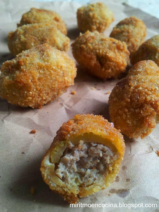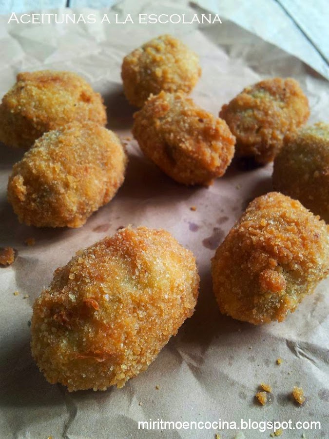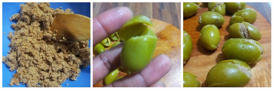 Posicionamos pequeñas cantidades de relleno dentro la aceituna, luego las pasamos por harina, huevo y en fin el pan rallado.