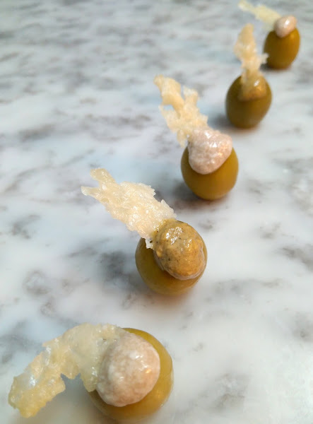 Ponemos cada crema en una manga y vamos rellenando las aceitunas.