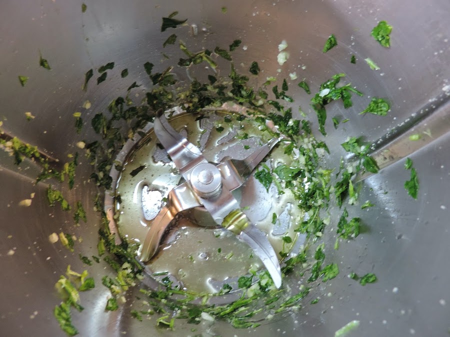Preparamos la picada, programando la thermomix, 20 segundos, velocidad 5 y por el vocal vamos añadiendo el perejil cortado, los ajos y sal, para que nos quede todo bien picado.