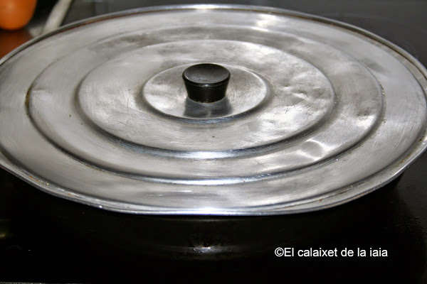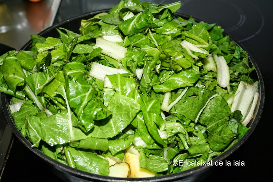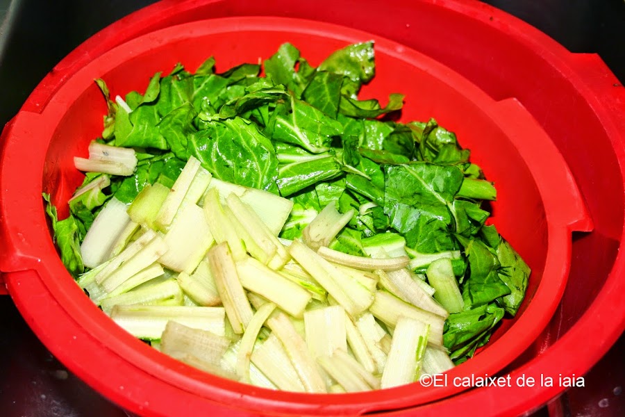 y tapamos porque éste plato se cocina con el propio vapor de las acelgas, a fuego lento, sin prisa y con cariño, a falta de perol de hierro y brasas para cocerlo