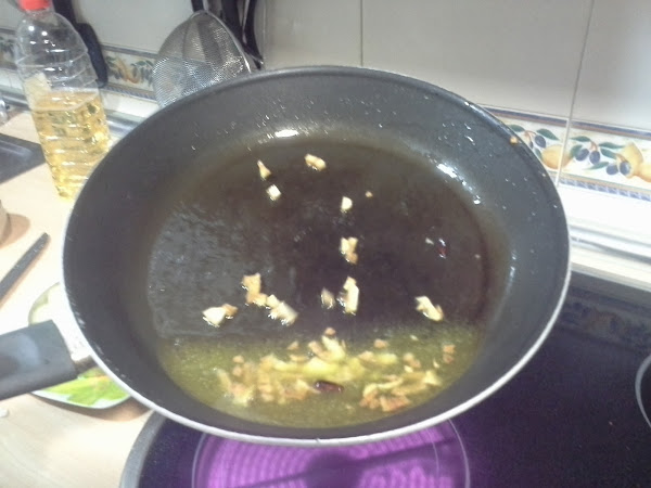 En una sartén echamos el aceite, los ajos y la cayena y lo freímos, cuando este, retiramos del fuego y al minuto de que haya enfriado, añadimos el vinagre