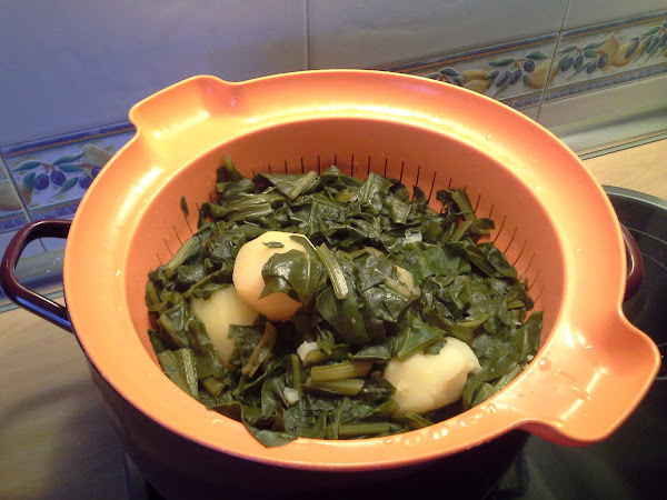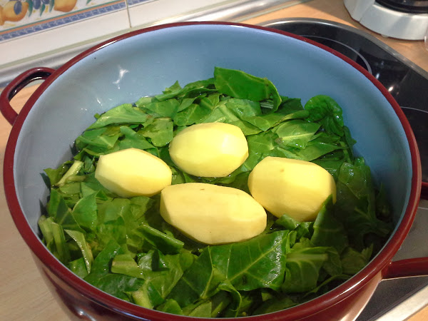 Vinagre 50 ml Ponemos en una cazuela las acelgas y las patatas , salamos y hervimos