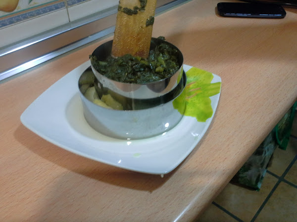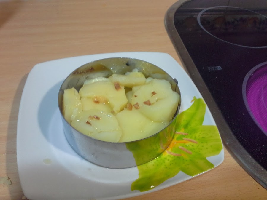 Presentamos la patata en un aro sobre un plato cortándolas en trozos y salamos un poco si la veis sosa