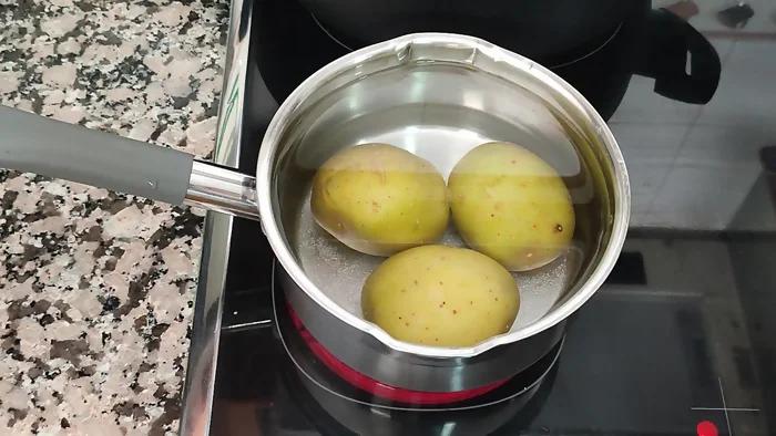 1 Empezaremos cociendo las patatas. Utilizaremos patatas de un tamaño similar, para que se cocinen al mismo tiempo. Las vamos a cocer con piel, así que, antes de nada, debemos lavarlas muy bien. Las colocaremos en una cazuela, las cubriremos con agua y añadiremos al al gusto.Dejaremos que cuezan a fuego medio y sin tapar. Podemos aprovechar mientras se están cociendo para ir limpiando, cortando y cociendo también las acelgas como te explico en el paso 2.