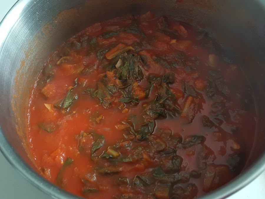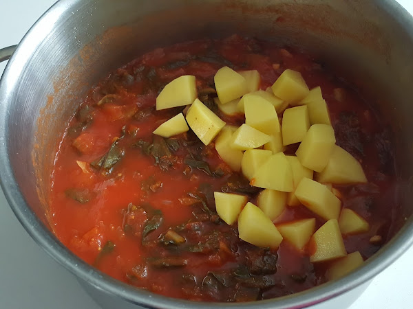 Realmente se trata de un sofrito de tomate al que le añadiremos las hojas de las acelgas y alguna patata troceada, si nos gusta con patata, claro.....