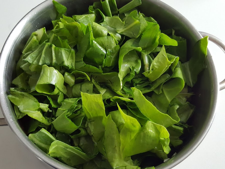 2. - Mientras se hace la cebolla, vamos troceando las hojas de acelga.