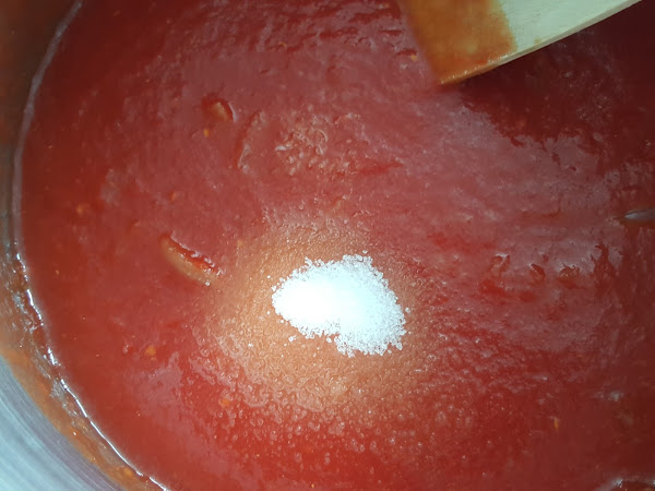 3. - Una vez la cebolla está hecha, añadimos el tomate triturado junto con el azúcar y un poco de sal, y dejamos cocer unos 15 minutos.