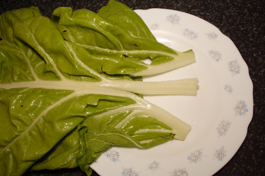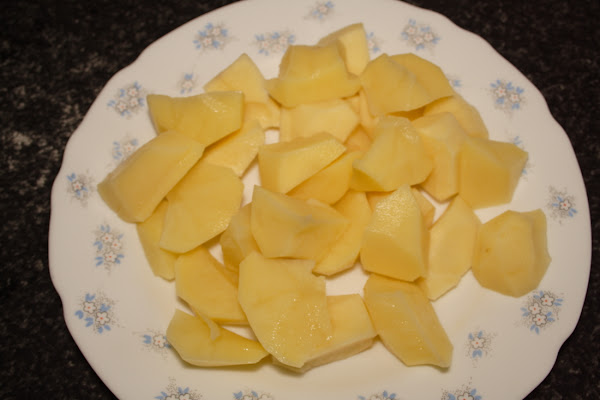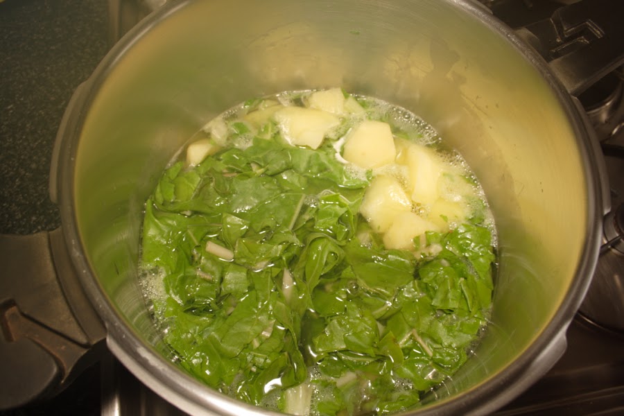 Lavamos bien las acelgas, las troceamos menudas, si el troncho es grueso, lo partimos en varios y reservamos. Pelamos y lavamos las patatas, las picamos cascandolas y reservamos.