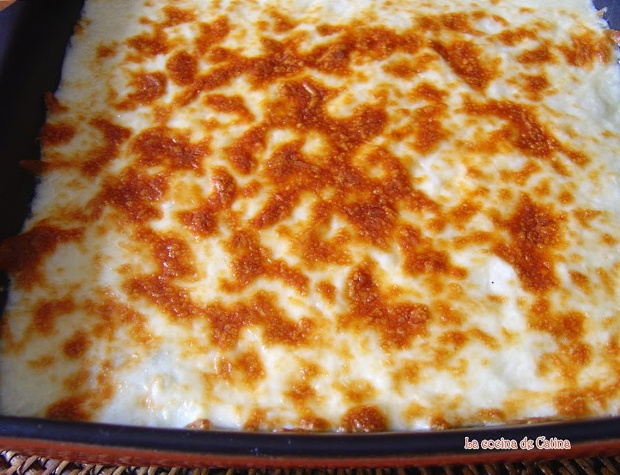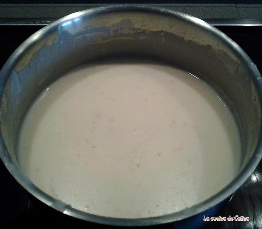Mientras calentar en un cazo la leche con la mantequilla. Espolvorear en el cazo la harina, remover constantemente con una cuchara de madera para que no se formen grumos y quede una salsa suave. sazonar con sal y nuez moscada.