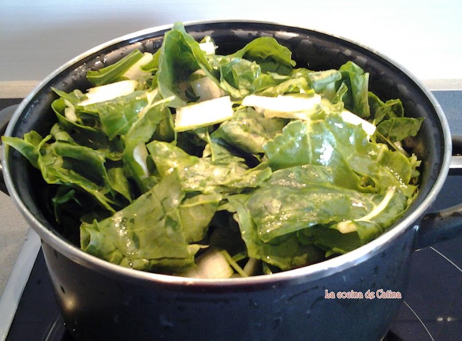 Limpiar bien las acelgas bajo el chorro de agua del grifo, escurrirlas y trocearlas. Cocerlas en una olla con agua, sal y un chorrito de aceite.