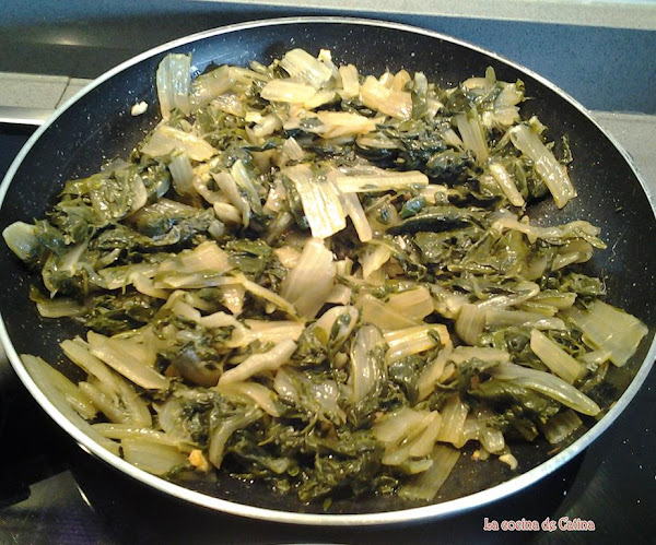 Escurrir muy bien las acelgas con las manos para quitarles toda el agua. En una sartén con un chorrito de aceite, freímos el ajo pelado y picado en trozos pequeños, añadir las acelgas y saltearlas durante unos minutos.
