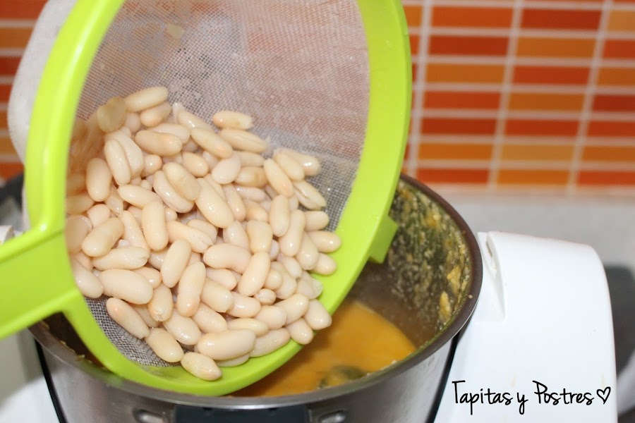 Mientras vamos lavando las habichuelas para quitarles el liquido de la conserva.