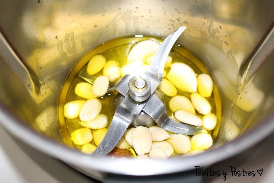 Añadimos los ajos y las almendras y sofreímos 5 minutos, varoma y velocidad 1.