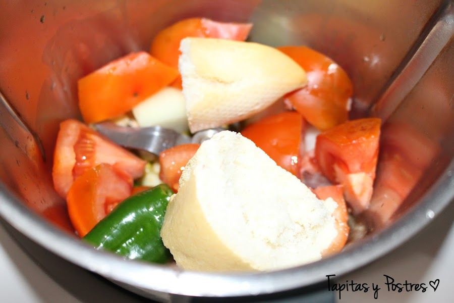 Agregamos la cebolla, tomate y pimiento troceado y el pan, lo troceamos 5 segundos a velocidad 5 y luego sofreímos 10 minutos, varoma y velocidad 1. Dejamos que baje la temperatura y trituramos 15 segundos a velocidad progresiva 5-10.