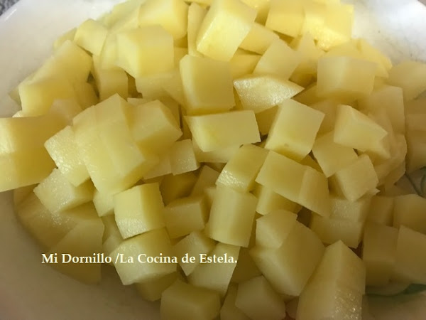 Cortar las patatas en taquitos.