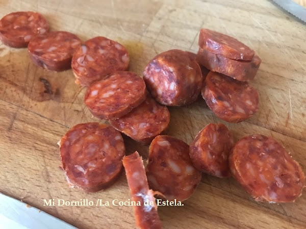 Quitamos la piel de los chorizos y los cortamos en rodajas.