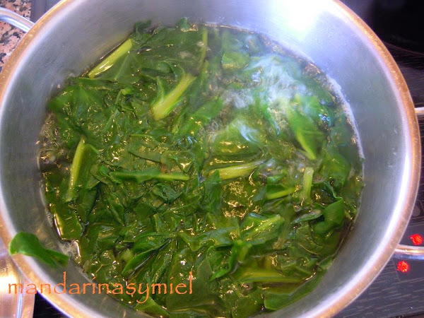 Lava y trocea las hojas de acelga, pela y trocea las patatas, ponlas a cocer en agua hirviendo con sal unos 15 minutos, no las cuezas más para que no se deshagan.