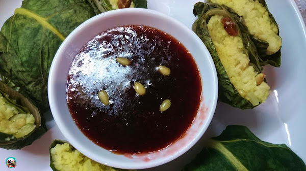 5.- Preparamos la salsa: Cazo ponemos la mermelada con la soja, la salsa inglesa, el jugo de limón y el vinagre. Calentamos unos minutos, retiramos del fuego y servimos en un cuenco con unos piñones por encima. Servimos la salsa con las verduras rellenas de cuscús.