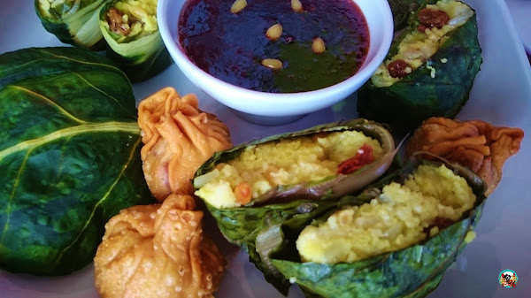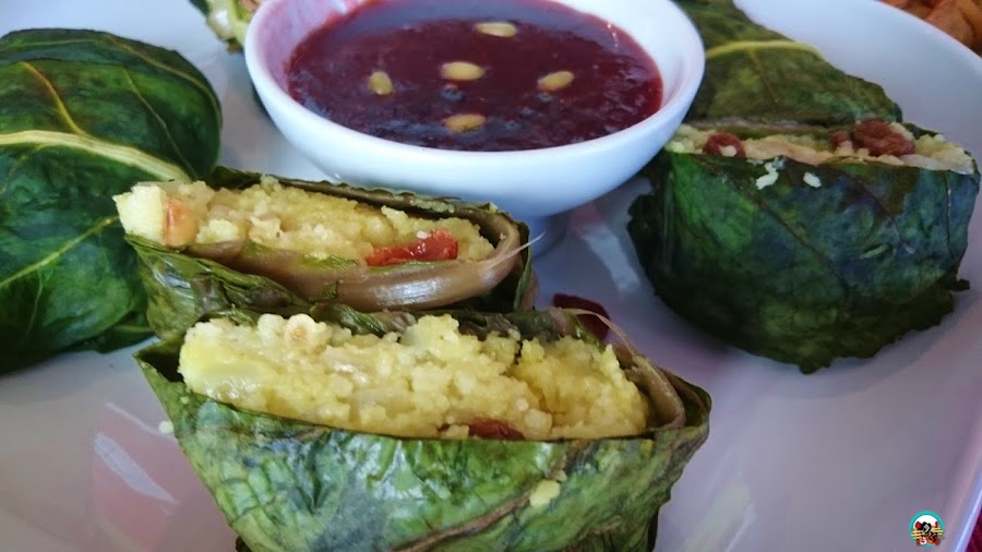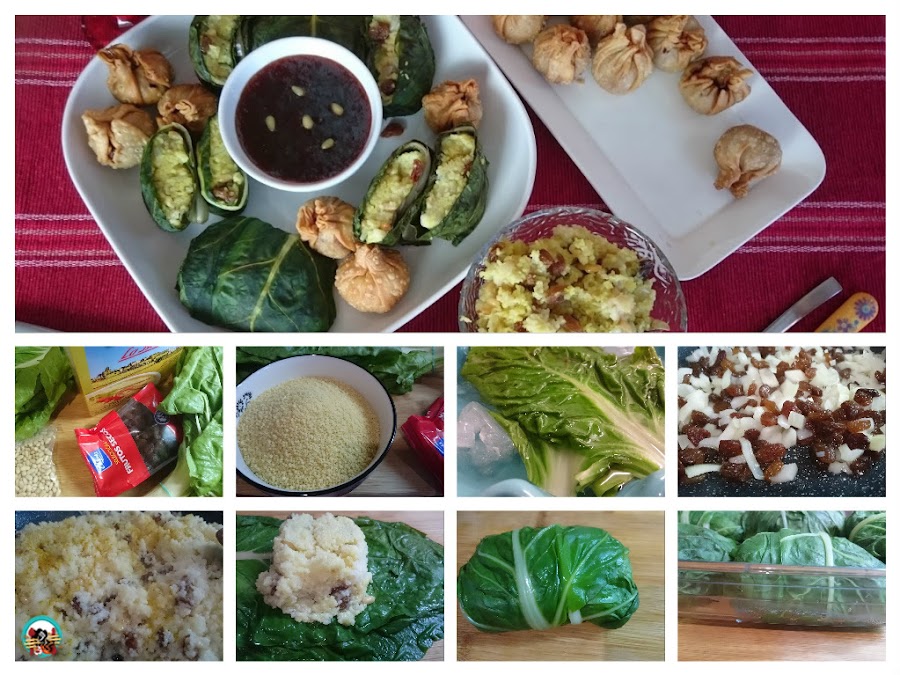 4.- Ponemos dos hojas de acelgas juntas, rellenamos el interior con unas cucharas de cuscús y cerramos en forma de paquititos. Así hasta rellenar todas las hojas. Nos saldrán 10 paquititos. Los ponemos en una fuente de horno y horneamos unos 10 minutos a 180ºC.