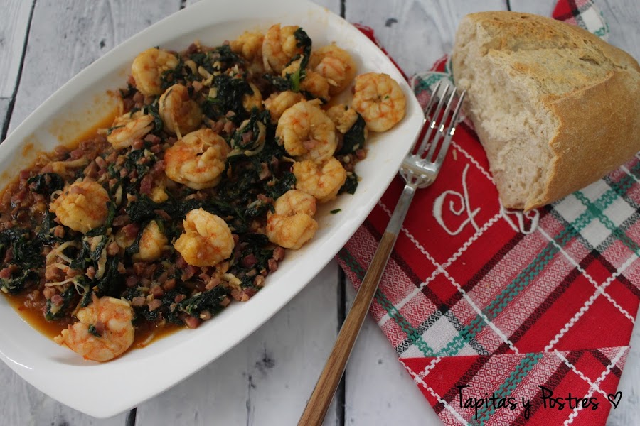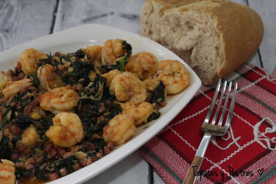 Para aprovechar unas acelgas que tenía en la nevera y unas gambas que había en el congelador, he preparado estas acelgas salteadas que están para chuparse los dedos.