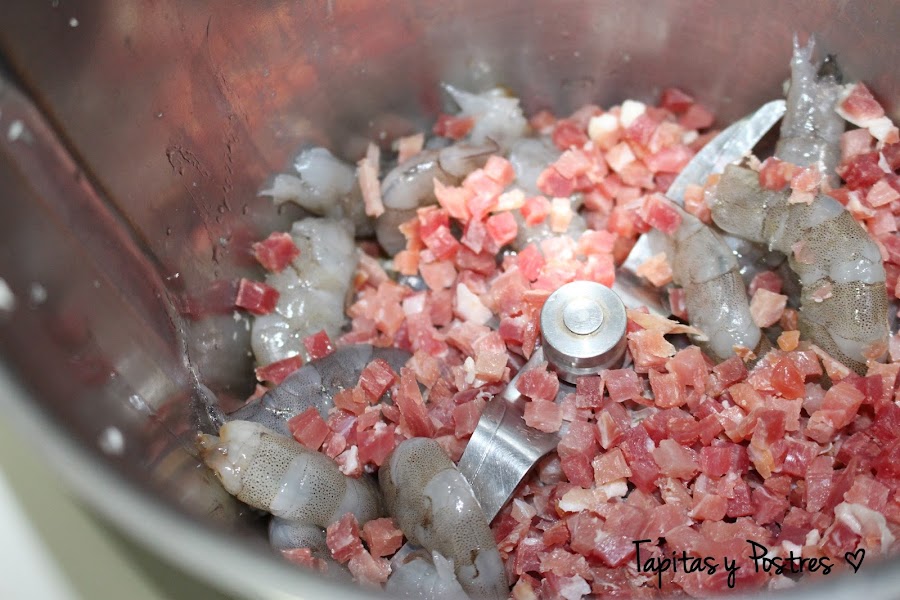 Incorporamos las gambas y el jamón y rehogamos 1 minuto, varoma, giro a la izquierda y velocidad cuchara.