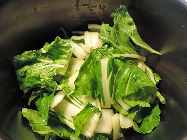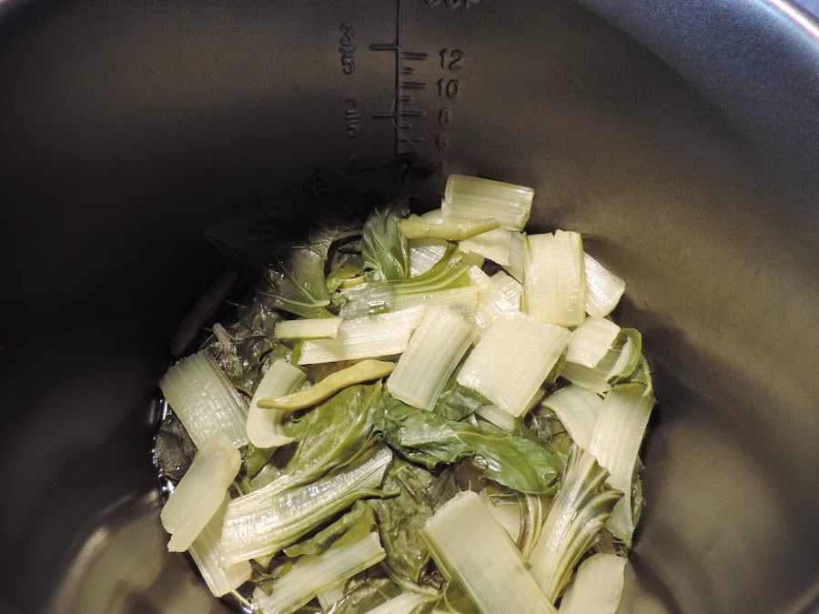 Poner la rejilla en la cubeta de la olla, echamos agua sin legar a cubrirla, el laurel, el diente de ajo, encima las acelgas limpias y cortadas en trozos.