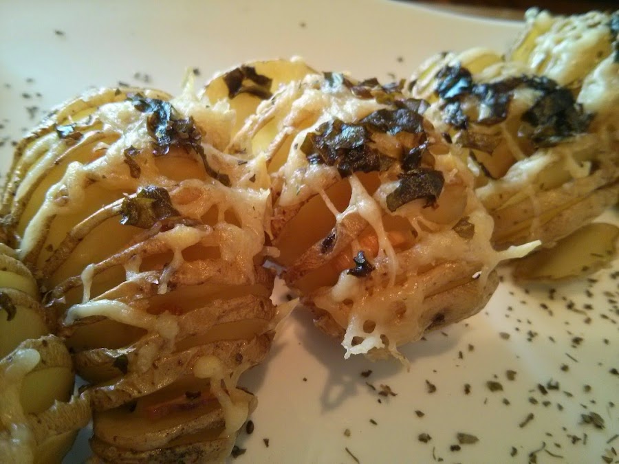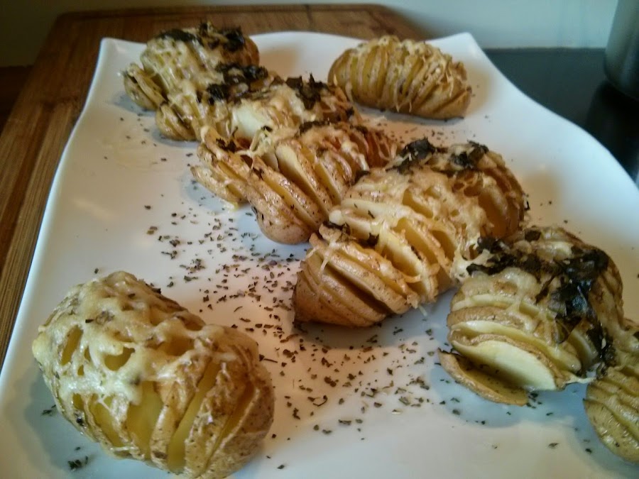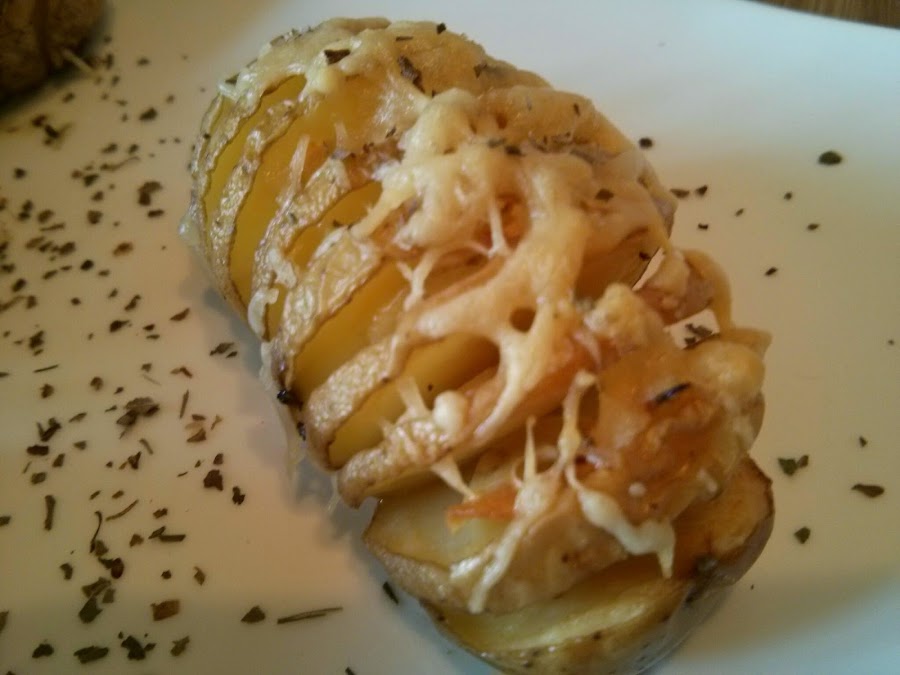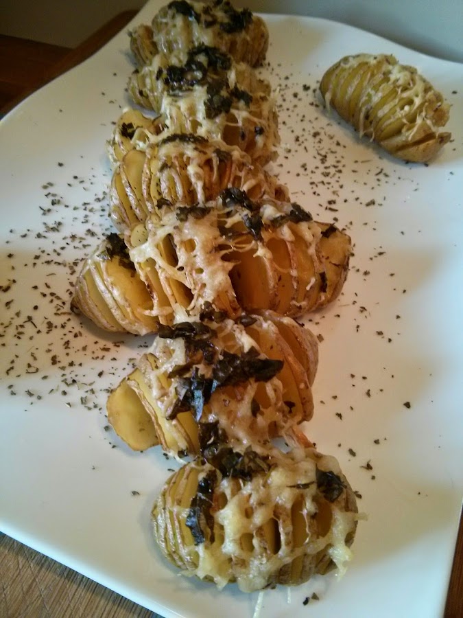 - Si las patatas son ecológicas, lavarlas bien y cortar con un cuchillo sin llegar al final del todo, a rodajitas pero dejándola entera. Si no son ecológicas pelarlas y cortarlas así.