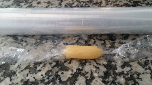 - Poner una puntita de colorante amarillo en un palillo y mezclarlo con la crema de limón. Si hubiese escogido utilizar una crema de mango creo que no hubiese hecho falta colorearla para que se pareciese a la foto. Coger una quenelle de crema de limón, y ponerla en un trozo de papel film. Cerrar el film intentando conservar la forma de quenelle, lo máximo psoible. Llevarla al congelador durante un par de horas.
