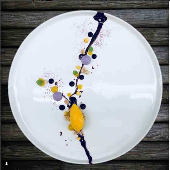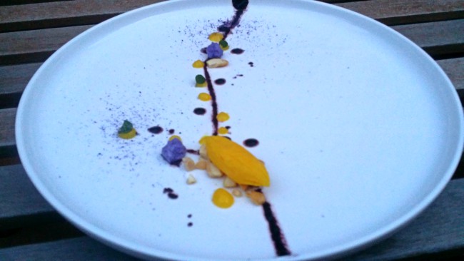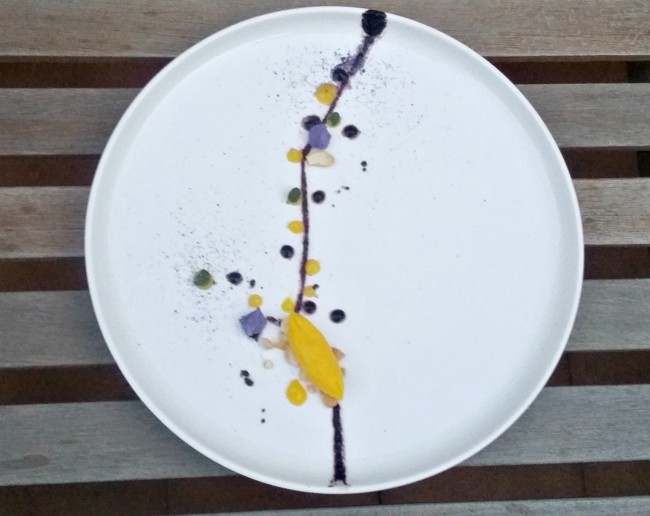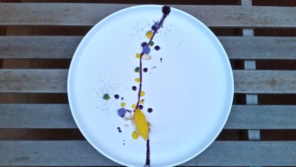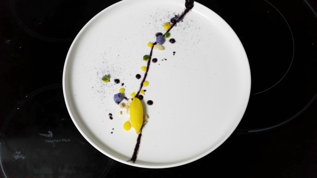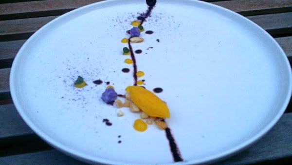 Y ¡vamos hayá! ¿qué veis en las fotos? Yo veo un helado congelado con forman de quenelle. Helado que puede ser de mango o de limón. Veo esa raya negra que identifico con chocolate, o moras como he hecho. Y lo demás, ya son adornos accesorios de plantitas y gotas de nata (crema de leche), de la crema del helado de azúcar coloreado o algo así. Incluso veo algún fruto seco. Y esto es lo que he hecho yo: