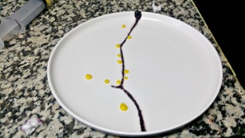 - Tras hacer la raya negra y las gotitas negras, he puesto la crema de limón en la jeringuilla y he ido colocando las gotas amarillas.