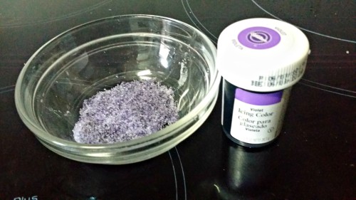 - Se pone el colorante lila en el azúcar y se mezcla bien para que se pinte. Se espolvorea en el plato, donde toca según la foto.