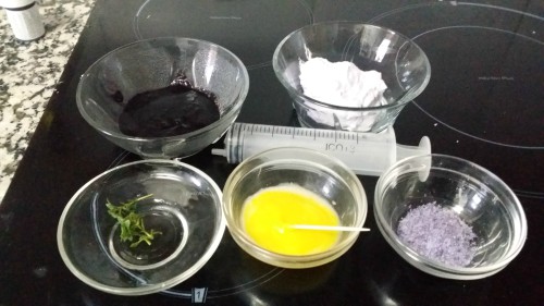- Se monta nata (crema de leche) y se le añade el colorante lila. Se ponen las dos gotitas en el plato en el lugar de la foto.