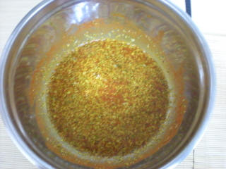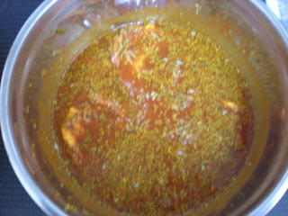 2. Se añade también una carterilla de azafrán, un poquito de sal y los ajos que hemos machacado en el mortero, seguidamente se echa el vinagre.
