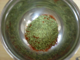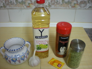 1. En un mortero se machacan los 4 ajos con un poquito de sal. Por otro lado en un bol grande se echan las 3 cucharas soperas de pimentón dulce y un buen puñado de orégano.