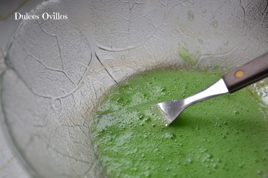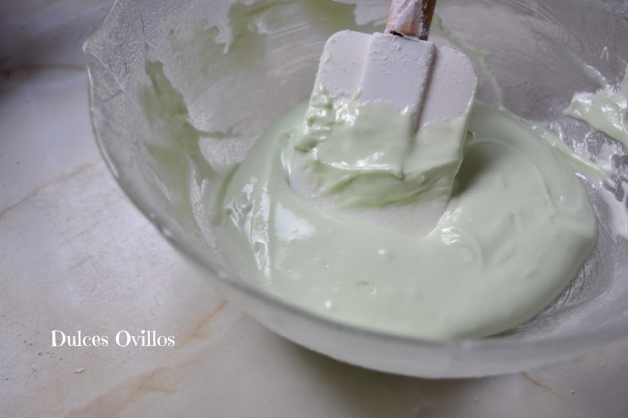 Mientras tanto preparamos el relleno, batiendo el extracto de menta con la clara de huevo. Cuando esté espumosa se añade el azúcar glass poco a poco y tamizado.