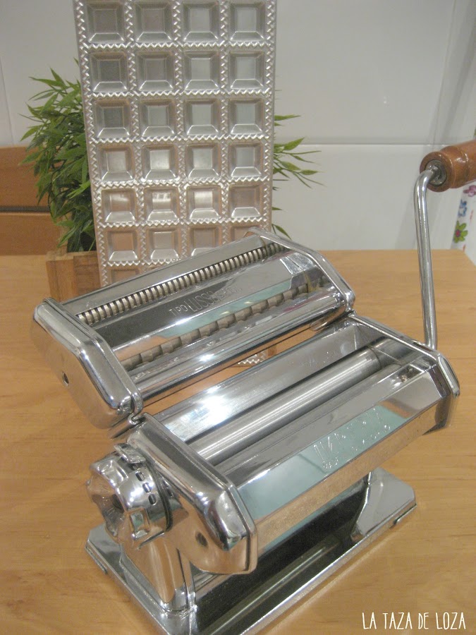 Aquí os enseño mi máquina para estirar la pasta fresca. El molde que hay detrás es para hacer ravioli, pones la lámina de pasta y el relleno en el centro y otra lámina de pasta fresca y se pasa el cortador de rueda dentada. En este caso no los he hecho así sino con cortador con forma de flor más grande que los ravioli que conocemos habitualmente.