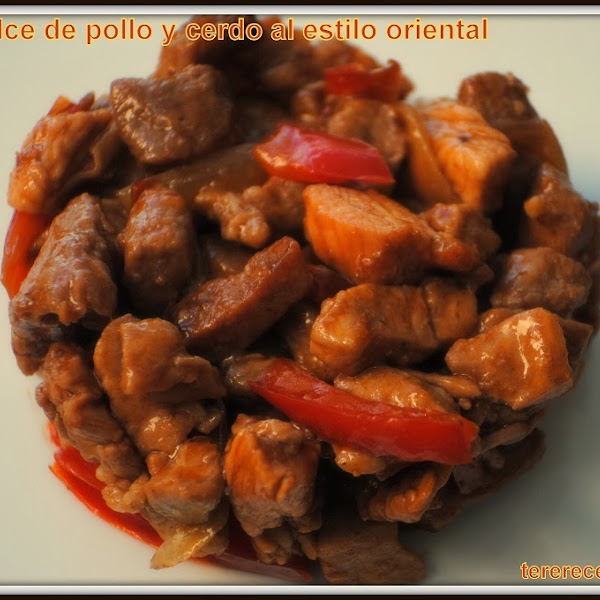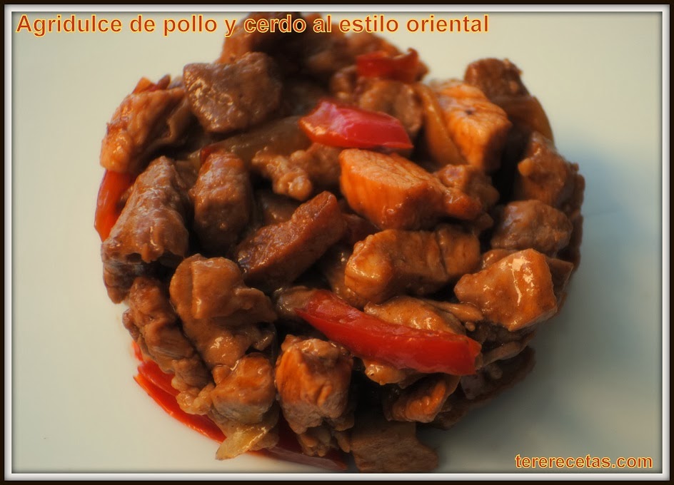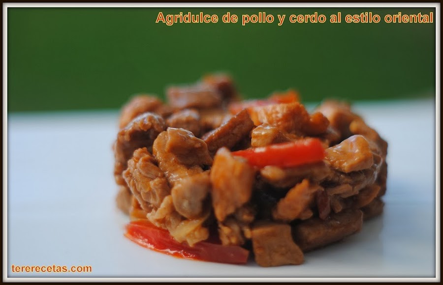 Hola a todos, este fin de semana pasado preparé un menú de comida al estilo oriental, platos sencillos de preparar pero no por eso dejan de estar riquísimos!! Aquí os presento una mezcla de carne de pollo y cerdo en una preparación agridulce que no deja a nadie indiferente!!