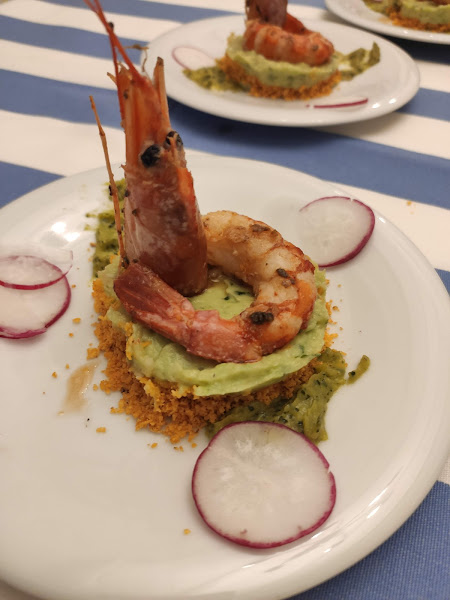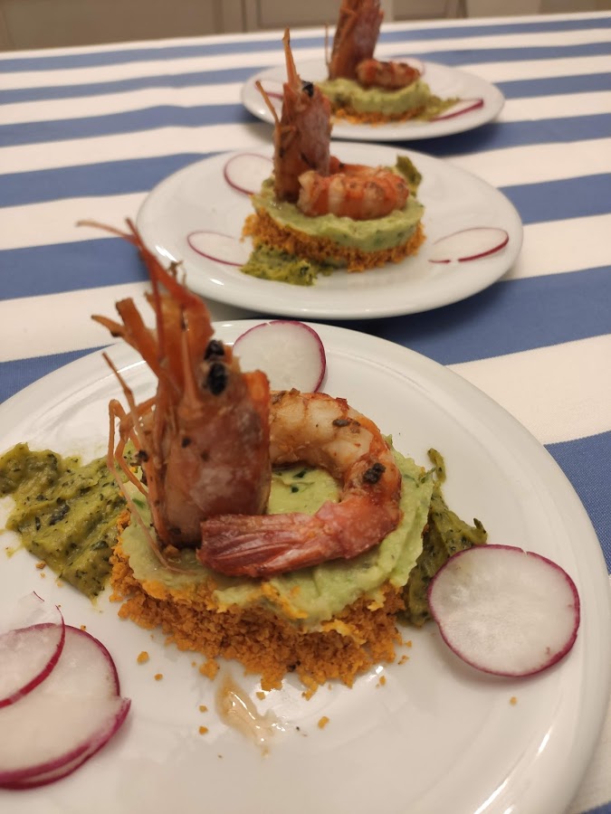 Completamos con los langostinos salteados, las hierbas, la cabeza del langostino, unas rodajas de rabanito y servimos.