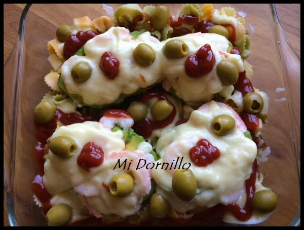 Pelamos los aguacates y los ponemos encima de la pasta aliñada ya. Rellenamos con las gambas peladas y le ponemos por encima la mayonesa, decoramos con el Ketchup y a la nevera, listos para comer cuando estén fríos.