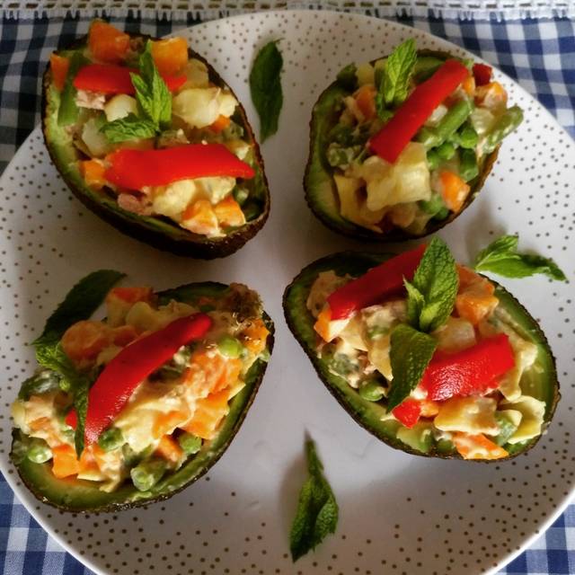 Cortar los aguacates a lo largo y sacar el hueso. Retirar parte de la pulpa y cortarla en trocitos, reparte la en los aguacates y termina rellenandolos con la ensaladilla. Servir fresquitos.