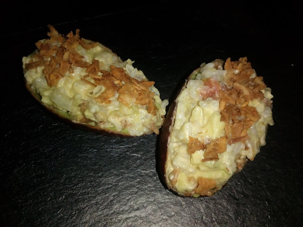 Por otro lado, abrís los aguacates les quitáis el huevo y los vaciáis, es mucho mejor que estén maduros. Cortáis su carne en trocitos y lo añadís también a la ensalada de arroz que teníais. Ahora rellenáis la cáscara del aguacate y coronáis con un poco de cebolla frita para darle un toque crujiente y ya está listo para servir. Lo podéis meter en la nevera y cuando lleguen vuestros invitados a comer servírselo directamente, ya veréis como les encanta este plato.