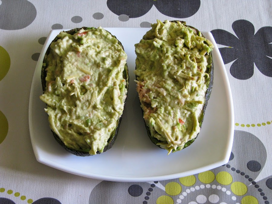 - Con la mezcla que queda, rellena las cáscaras del aguacate y emplata.