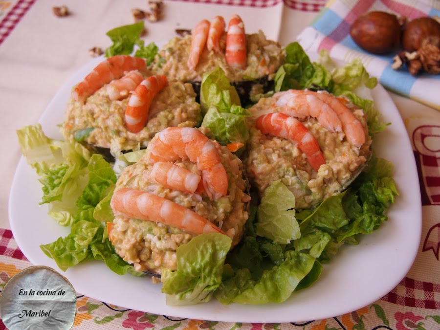 Una vez que tengamos todo cortado lo metemos en un bol, y juntamos revolviendo todo junto un poco de mayonesa. Vamos rellenado los aguacates, y colocando en una fuente.