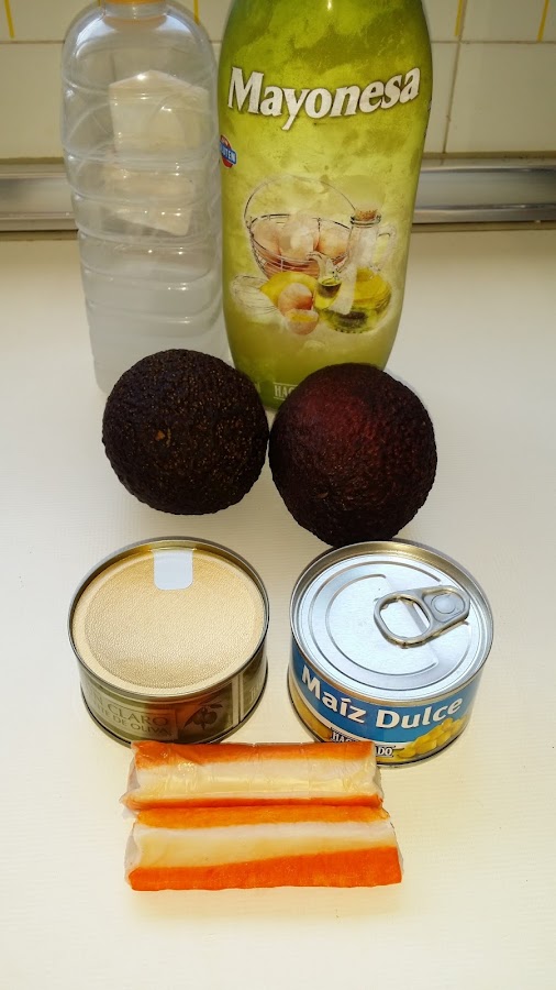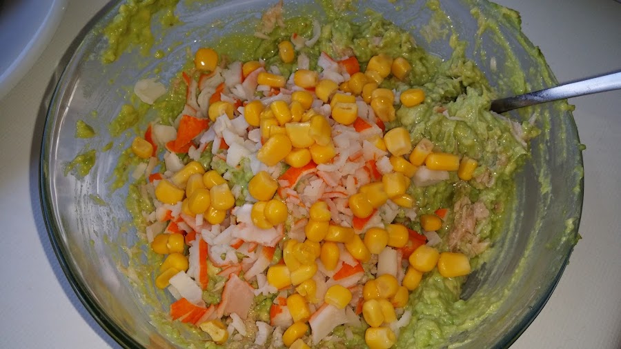 Una vez tengamos una pasta, añadimos el atún escurrido, el surimi a trocitos y el maíz. Condimentamos con un poco de mayonesa o salsa rosa, lo que más os guste.