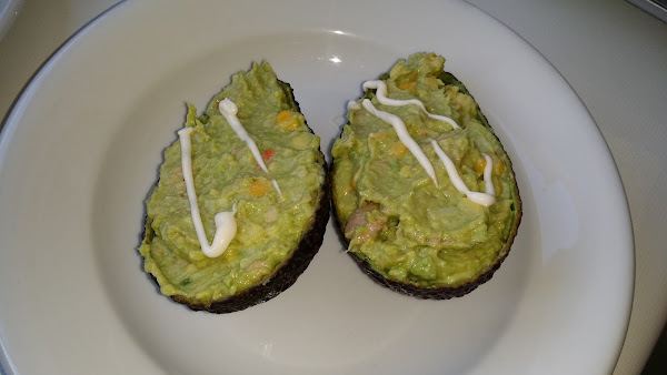 Y ya solo quedará volver a rellenar los aguacates con la mezcla que acabamos de preparar. Se puede dejar preparado en la nevera para servir más tarde, pero es necesario envolver los aguacates con film transparente y que este toque la mezcla para que no se ponga negro.