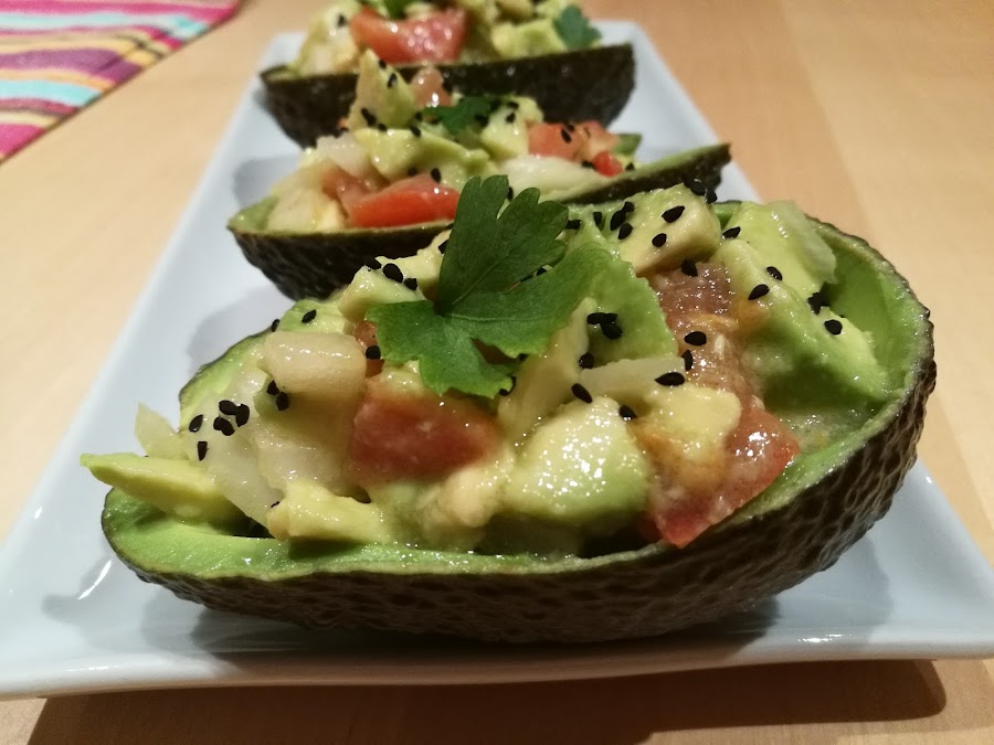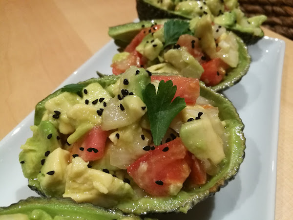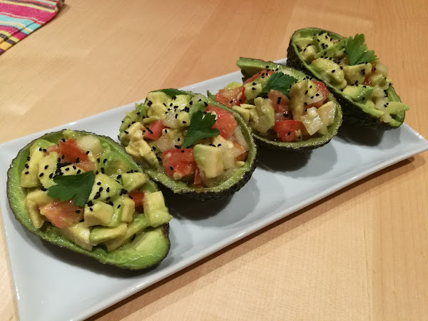 En realidad es como una deconstrucción de un guacamole...jajajajajajaj. Es una idea fantástica para invitados, porque queda muy bonito y es muy fácil de servir y comer....y por si fuera poco, está buenísimo!! es un cuatro estaciones, pega igual en verano que en invierno, aunque se tome frío.